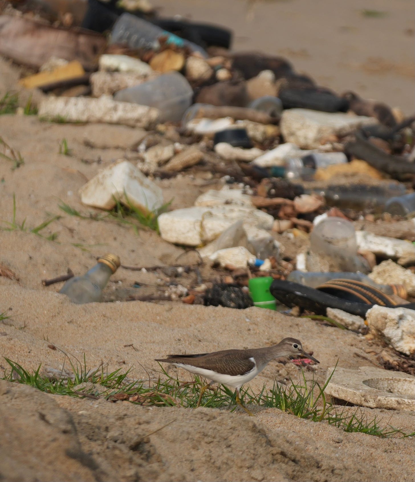 I reached the mouth of the estuary where a sandpiper poked amidst the trash, cormorants sat around and egrets and pelicans fished.